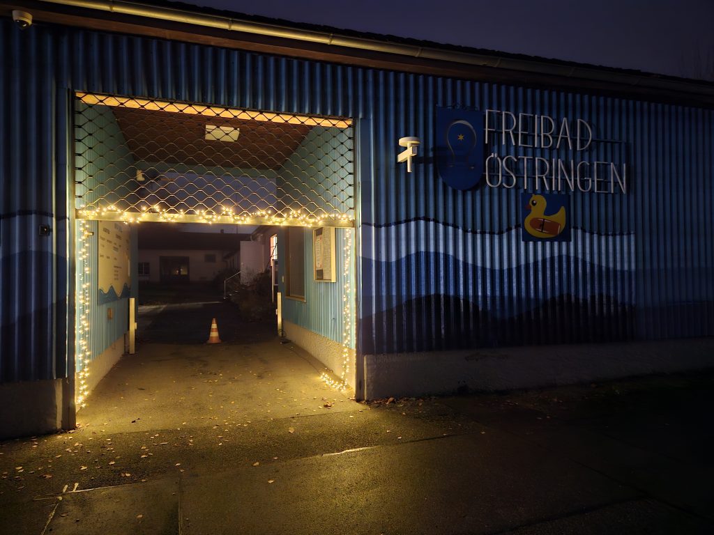 Der Bereich des Freibads rund um Einlass und Kiosk bekamen durch die vielen Lichter und Beleuchtung einen besonderes Ambiente verliehen.